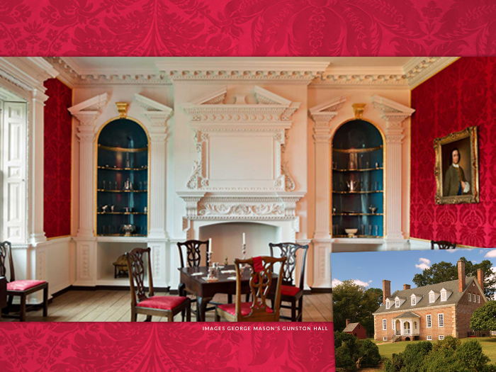 A circa 1750 English design found at George Mason's mid-18th century Georgian residence, was the inspiration for the “Hunt Damask.” This reproduction fabric was installed as draperies and wall upholstery in the master bedroom.
