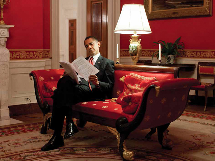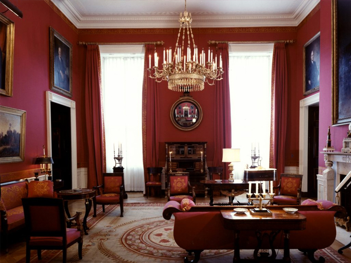The United States 44th President, Barack Obama, sits and reads in the current White House “Red Room,” amongst Scalamandré made silks and trim, originally installed during the Kennedy term. Updated and recolored, the custom “Empire Scroll 3 ½” Galoon” trim traces the red room walls, as it has through countless presidential terms.