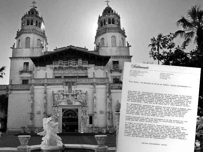 The founding of Scalamandré Silks coincided with a growing movement in the United States surrounding the restoration of historic houses and furnishings. Following this movement, Scalamandré was contracted to weave seven yards of fabric to match a blue brocatelle acquired by media mogul William Randolph Hearst, for his home.