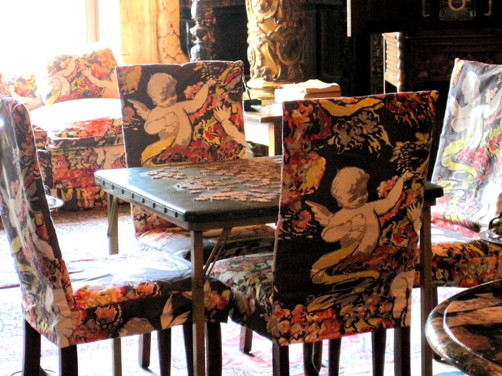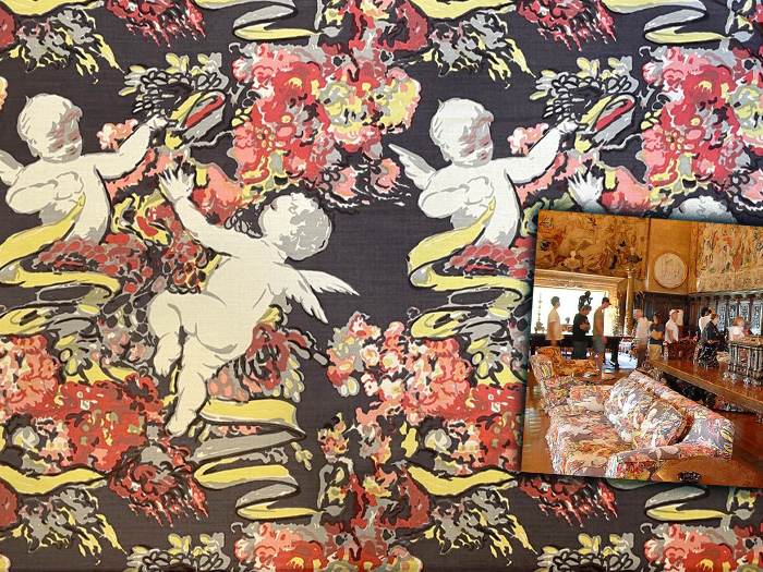 The “San Simeon Brocatelle” led to other commissions for William Randolph Hearst, such as the “Cherub Print” that was designed by Franco’s daughter, Adriana, when she was only twelve. The “Cherub Print” was made into slipcovers for the sofas and chairs in the Assembly Room at San Simeon.
