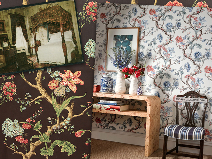 In the spring of 2019, fresh re-colorations of several signature archival designs including “Andrew Jackson Floral,” were launched as digitally printed wallcoverings in a collection called Arcadia.