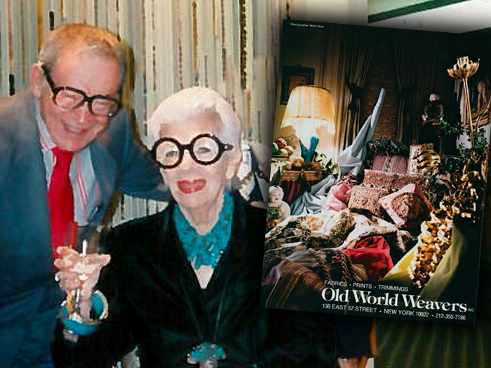 Iris Apfel originally worked as an established and successful interior designer, with a passion for fabrics. Iris and her husband, Carl, traveled all over the world attending international flea markets and bazaars to source furniture and rare fabrics for personal inspiration as well as design projects. With such a high demand for these treasured fabrics, sourcing them for large scale projects became close to impossible. This lead the Apfels to open Old World Weavers in 1950, in order to replicate the magnificent historic fabrics found on their travels. Old World Weavers became a success, known then and now for its blend of sophisticated historical design, and an exotic, world travelled aesthetic.